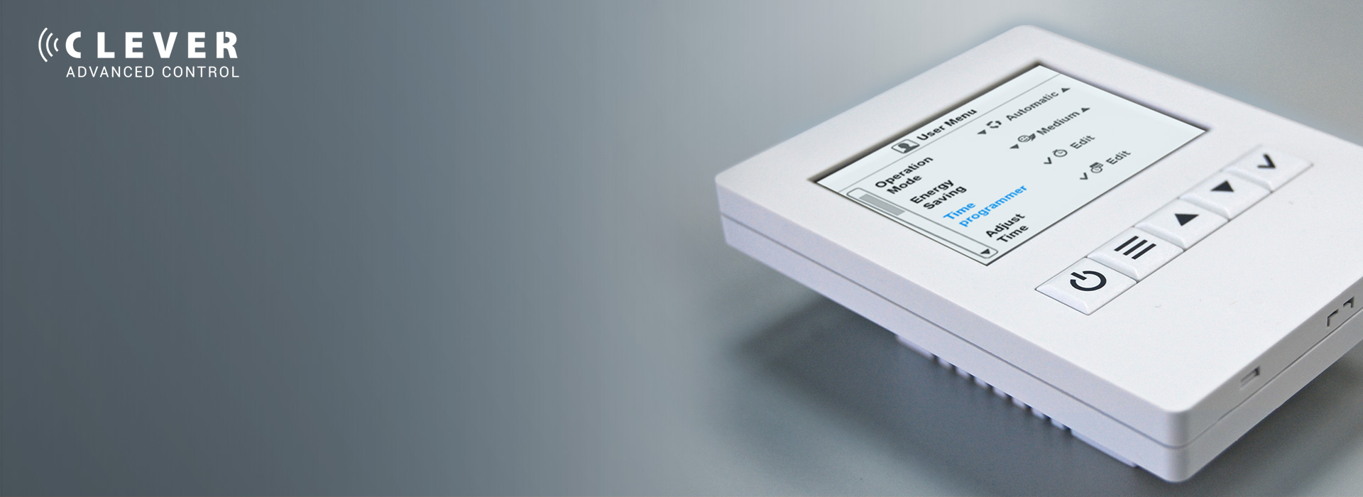 MultigerätsteuerungCLEVER PCB kann verschiedene Geräte steuern: Türluftschleier, Heizlüfter, AHU, usw. 1 CLEVER Bedieneinheit kann bis zu 255 verschiedene Geräte regulieren, jedes mit seinem eigenen Programm