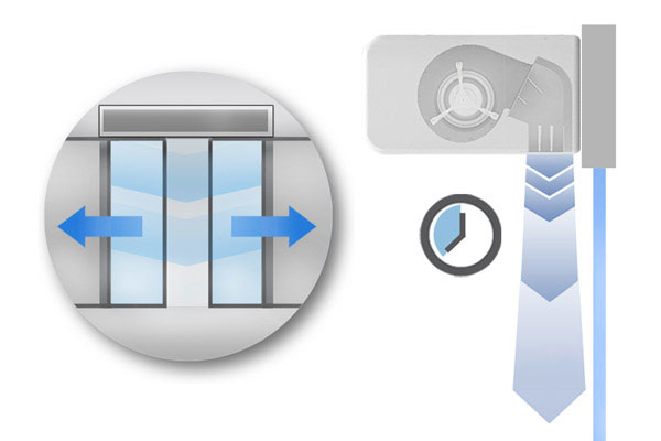 Anpassungsfähige TürverzögerungWenn die Tür sich schließt, läuft der Türlftschleier für eine gewisse Zeit, als ob die Tür geöffnet wäre, um bereit zu sein, falls die Tür sich wieder öffnet.