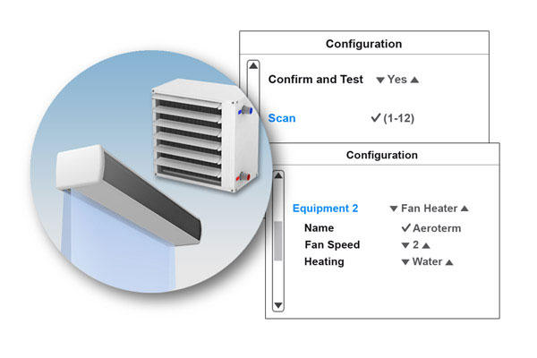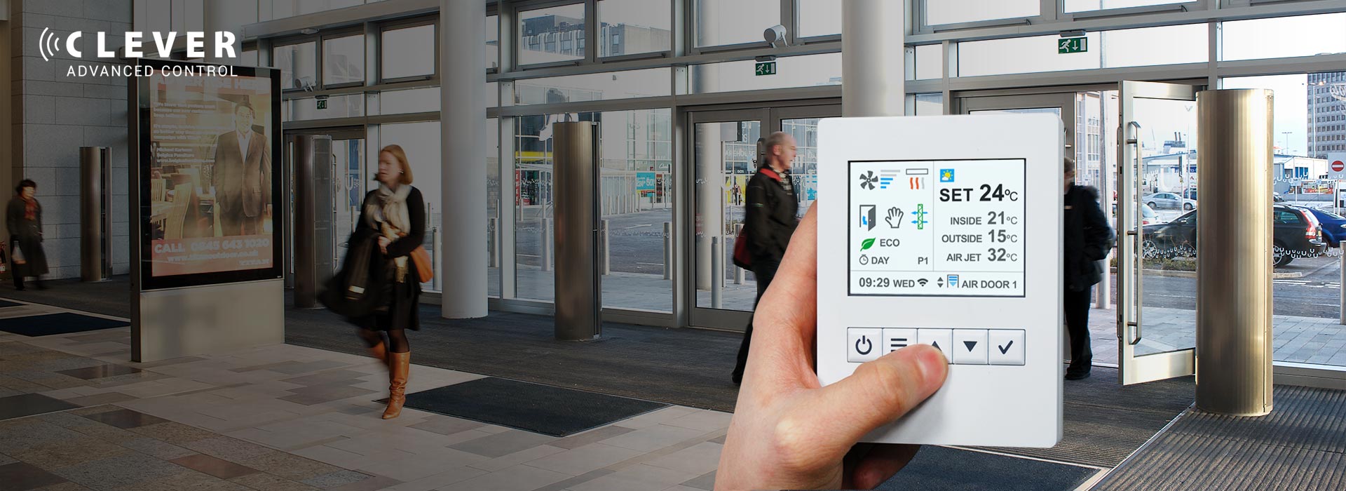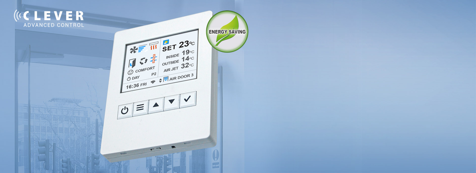 MultigerätsteuerungCLEVER PCB kann verschiedene Geräte steuern: Türluftschleier, Heizlüfter, AHU, usw. 1 CLEVER Bedieneinheit kann bis zu 255 verschiedene Geräte regulieren, jedes mit seinem eigenen Programm